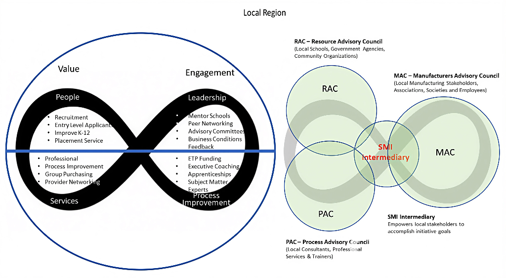Since 1994, SMI has built a regional networking model that empowers local manufacturers, educators, and community leaders to work together on common goals. The structure fosters leadership through convenience, communication, and a strong sense of community—making collaboration a practical business strategy rather than an occasional event. Each Regional Leadership Council serves as a hub where small and mid-sized manufacturers can share resources, align training needs, and engage directly with schools and policymakers. This approach keeps solutions local, measurable, and sustainable, ensuring that public and private investments deliver real value to companies and workers. With decades of experience mobilizing companies around shared priorities such as apprenticeships, mentoring, visibility, and workforce training, SMI’s regional model turns cooperation into a competitive advantage—strengthening both industry performance and community prosperity.